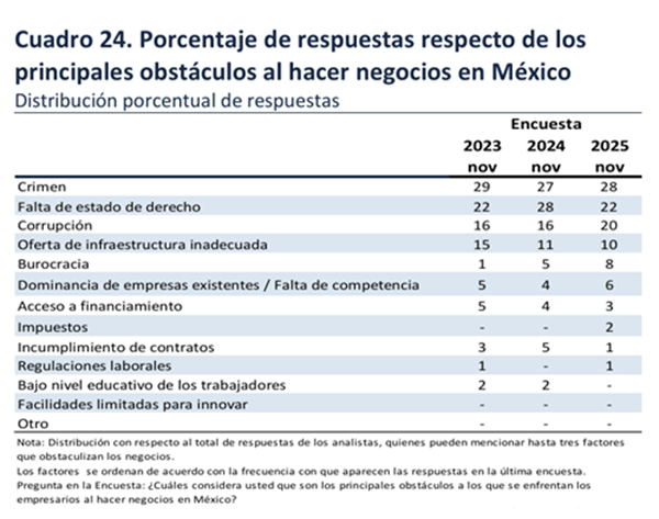 Los 42 grupos de consultoría económica nacional e internacional consultados para la elaboración de la Encuesta sobre las Expectativas de los Especialistas en Economía del Sector Privado: Noviembre en las que 7.0 es el mayor nivel de preocupación, revela que la gobernanza ocupa 5.8 puntos y las cuestiones particulares son la inseguridad pública, estado de derecho y corrupción.