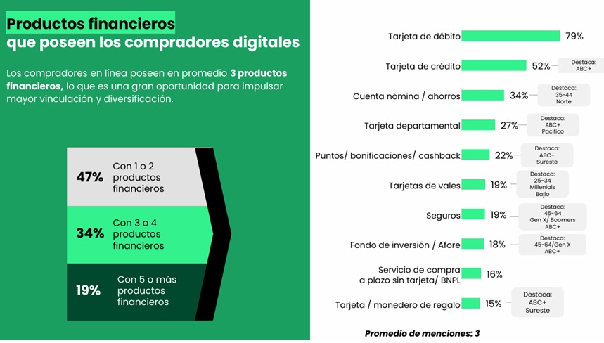 El estudio Ecosistema Financiero Digital 2025 se detectó que los usuarios de comercio digital tienen como principal instrumento financiero para su adquisición a la tarjeta de débito con 79 por ciento, le sigue la de crédito con 52 por ciento y en tercera posición está la tarjeta de nómina y ahorros con 34 por ciento.