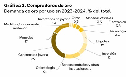 Los principales compradores son la industria joyera con alrededor de 30 por ciento, seguida de monedas y lingotes, así como por parte de bancos centrales e inversionistas.