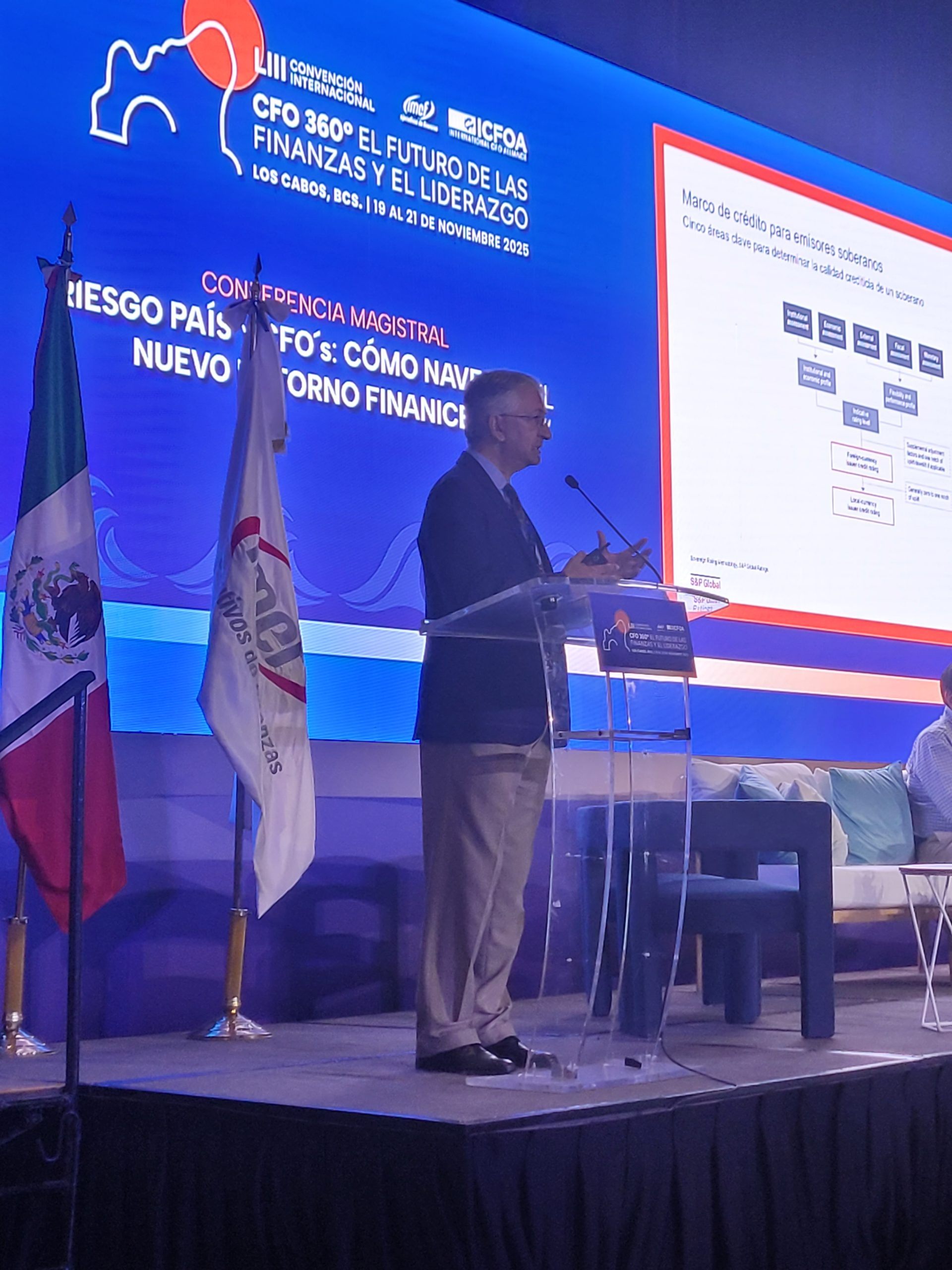 En su presentación Riesgo país y CFO’s: Cómo navegar el nuevo entorno financiero apunta que México no tiene en el corto y mediano plazos riesgos por su calificación crediticia soberana.