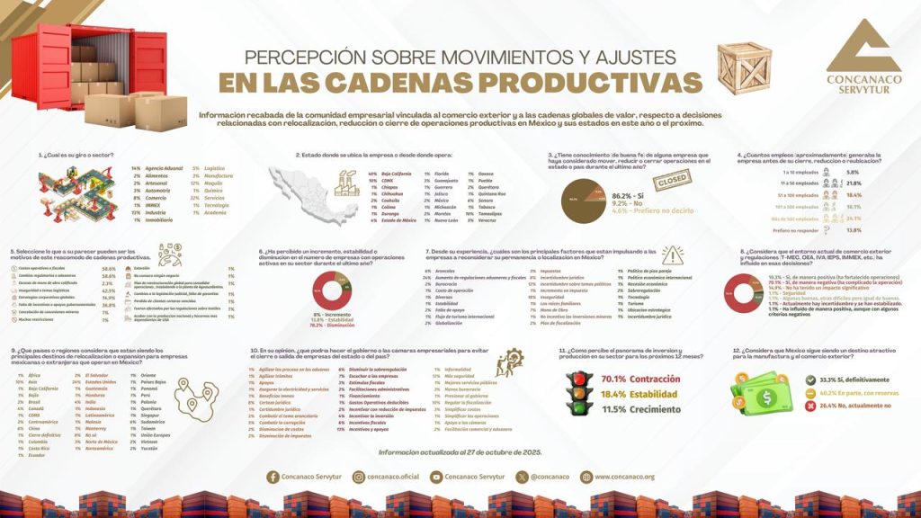 Un 58.2 por ciento de los encuestados expusieron que sus movimientos fuera del país o cierre de operaciones se debe a un aumento de costos operativos o fiscales. Además, un 41.8 por ciento señaló los cambios regulatorios o aduanales