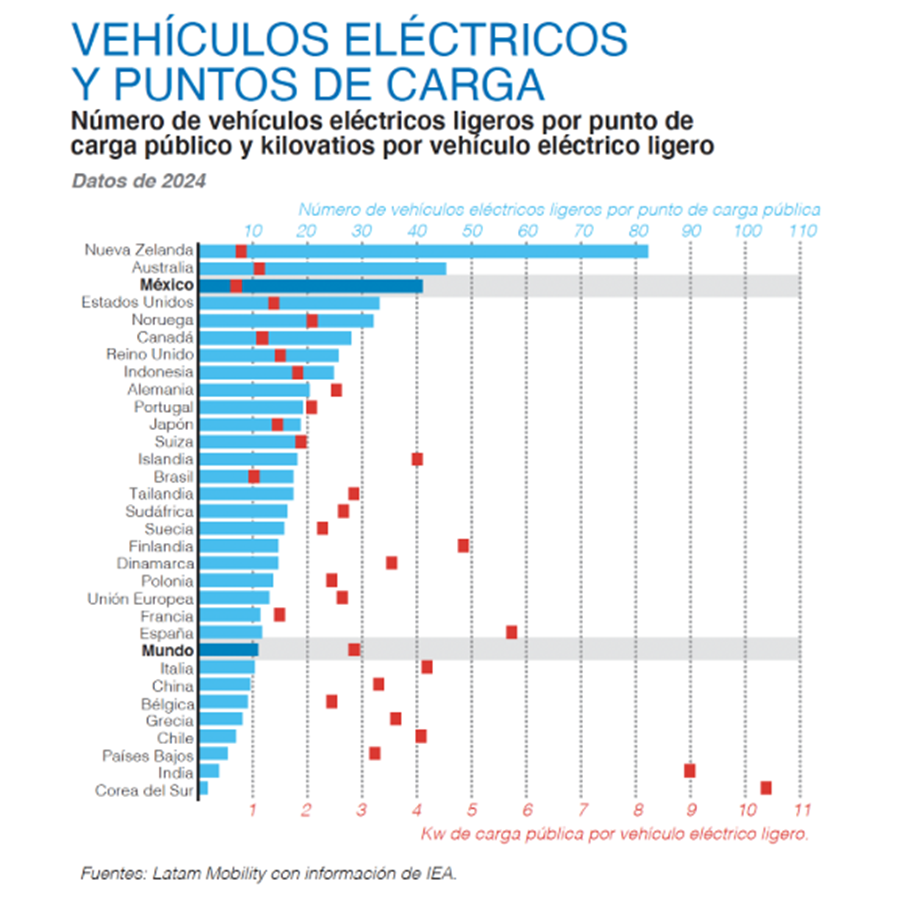 El informe EvolvX revela información clave sobre la infraestructura de carga en México. El país cuenta actualmente con alrededor de 40 vehículos eléctricos ligeros por punto de carga pública, la tercera posición a nivel global, detrás de Nueva Zelanda y Australia.